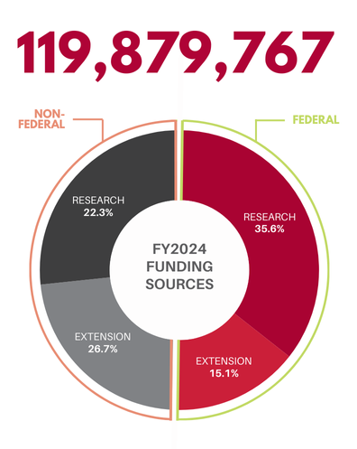 CAHNRS is a leading driver of research at WSU, contributing to more than 31 percent of the university’s extramural funding budget. CAHNRS research and Extension faculty brought in more than $119 million in FY2024 from competitive extramural funding sources including federal agencies, Washington state commodity commissions, and other nonfederal agency grants.